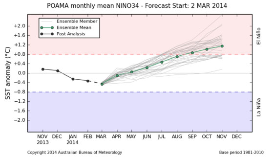 Cependant, de forts vents d’ouest se sont levés dernièrement, corroborant les résultats des modèles (POAMA) prévoyant un Niño pour cet été (boréal).