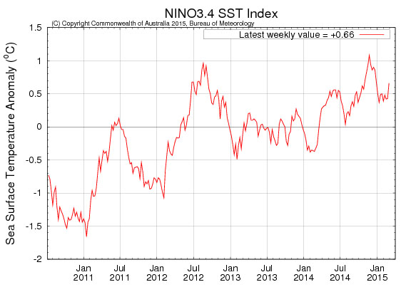 Selon le site australien de météorologie, le Pacifique équatorial Est et central s’est réchauffé de 0.2 à 0.3°C et les températures de sub surface de 2°C.