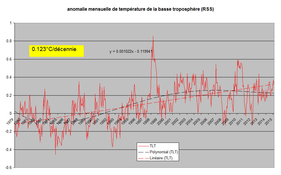 l’anomalie de température de la basse troposphère s’établit à 0.33°C, soit 0.1°C de plus que la moyenne de la dernière décennie (2005-2015).