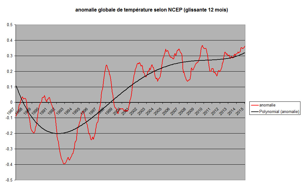 Avec l’épisode Niño actuel, la température repart à la hausse pour atteindre une valeur moyenne sur 12 mois glissants très haute en ce mois d’août (0.361°C) mais encore légèrement inférieure à la moyenne 12 mois de juin 2010 (0.365°C).