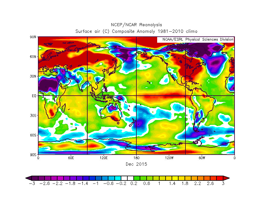 Pour l’année 2015 l’anomalie globale atteint la valeur de 0.463°C, soit la plus chaude jamais relevée par NCEP depuis 1948, la deuxième étant 2005 avec 0.345°C.