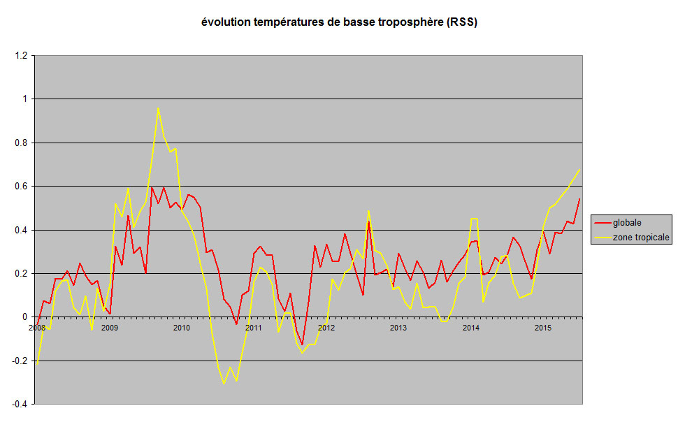 Nette augmentation de la température globale de la basse troposphère selon RSS avec 0.54°C.
