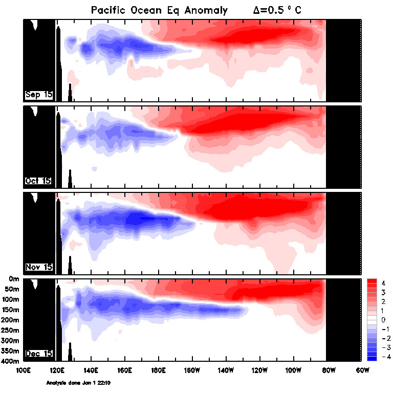 anomalie de température en profondeur: on voit nettement l’épaisseur de la zone chaude diminuer tandis que la thermocline se soulève à l’est et l’anomalie froide progresse rapidement.
