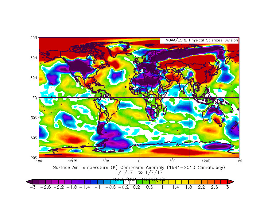 Voici donc la première semaine de janvier 2017 selon NCEP par rapport à la moyenne 1981-2010: