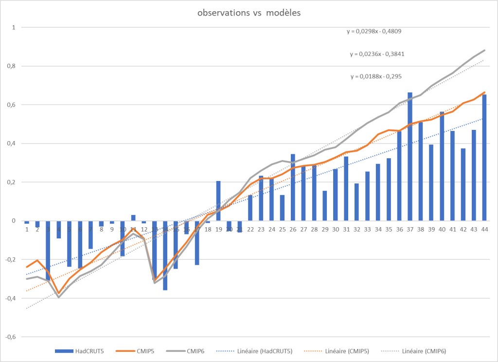 En terme de réchauffement en 2100, par exemple, les CMIP5 nous donnent, par rapport à 1980, une augmentation de 2.83°C, les CMIP6, 3.58°C, et les observations, 2.26°C.