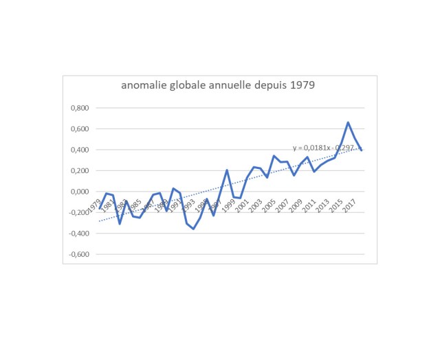 La moyenne annuelle s’élève à 0.396°C ce qui place 2018 à la 4ème place des plus chaudes.