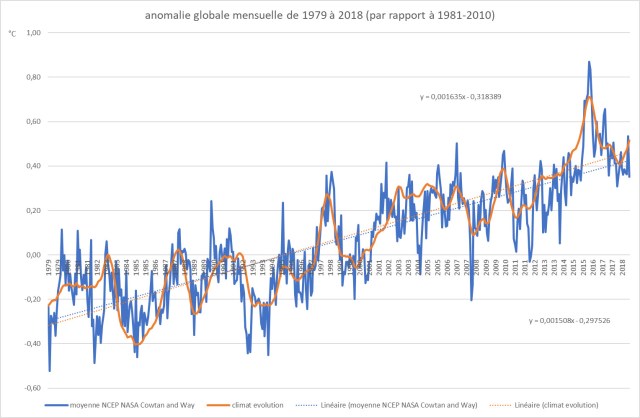 Le graphe ci dessous, montre cette évolution, les observations NASA-GISS de 1979 à 2018 corroborant presque parfaitement la justesse du modèle CE:
