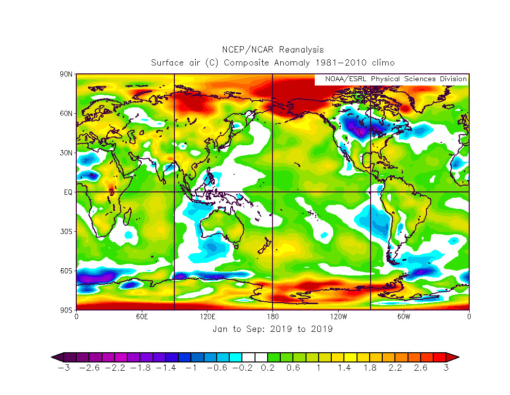 La base de données NASA-GISS qui constitue la seule base de données de température prenant en compte l’ensemble du globe, donne une anomalie globale de 0.52°C plus proche encore du 0.47°C CE.